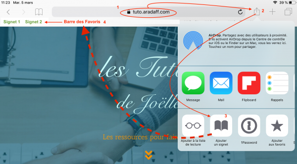 Lorsqu’on est sur la page que l’on souhaite garder en favori, bookmark ou signet (ce sont les différentes appellations selon le logiciel utilisé) la page affichée, on fait un tap sur le bouton partager (2) en haut à droite.