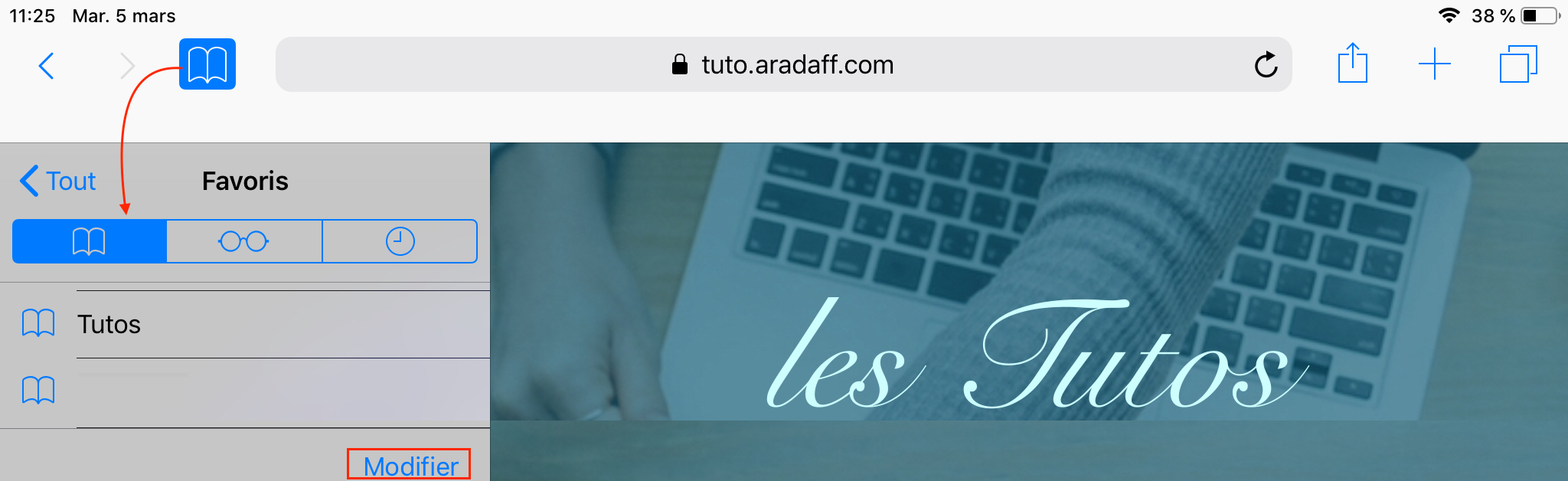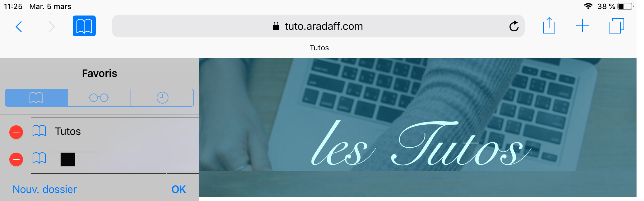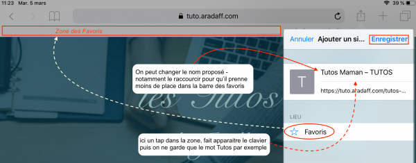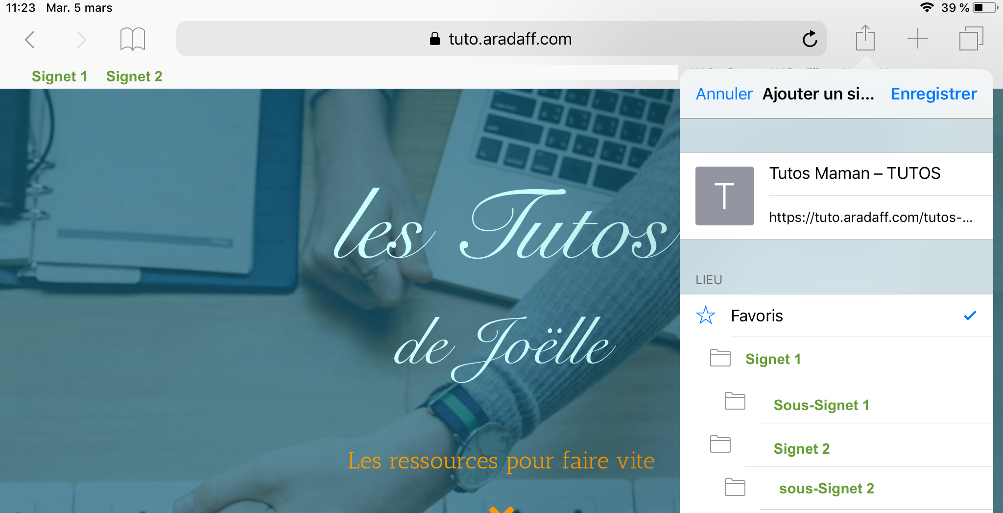 Pour ne pas avoir à se souvenir d’une adresse Internet, il est conseillé d’ajouter le site web consulté à ses signets. Par la suite il suffit de faire un tap sur le signet (bookmark en anglais) pour accéder au site. Description de la démarche sur Safari iPad.