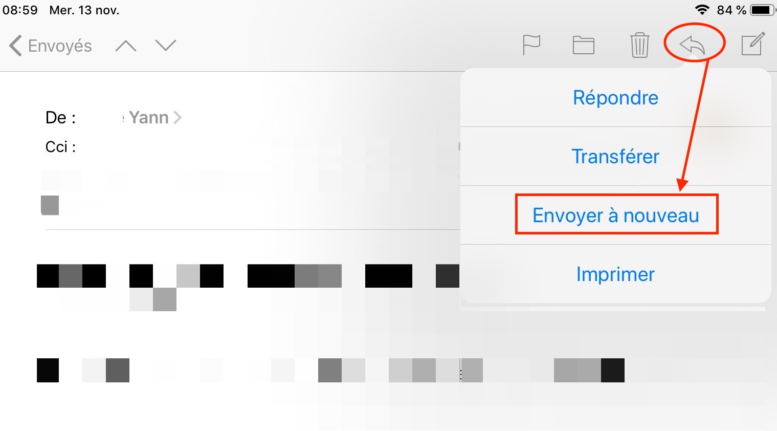 Envoyer à nouveau, permet de s’approprier un mail reçu et de le renvoyer à nouveau, tel qu’il serait s’il avait été initialement envoyé par moi-même
