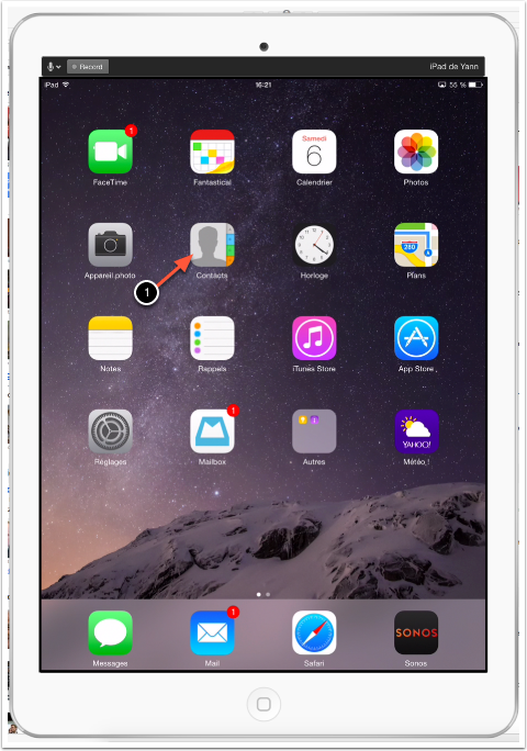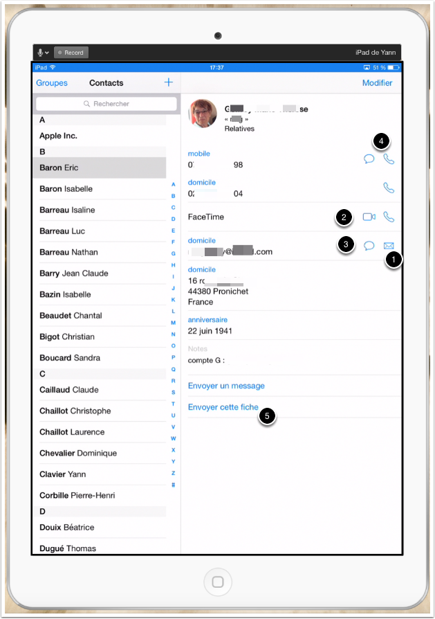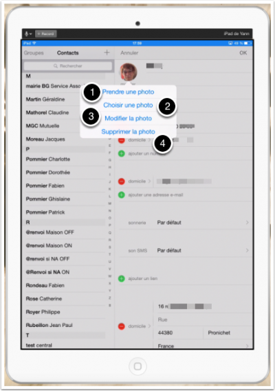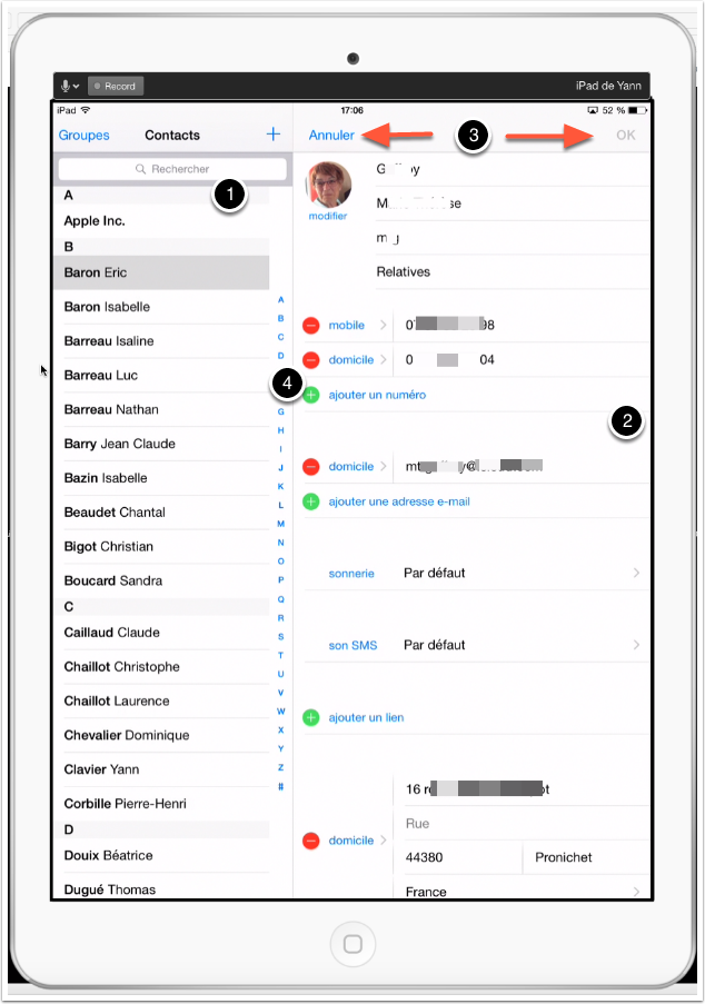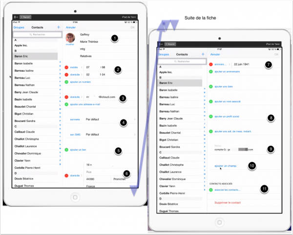 Depuis le carnet d’adresses CONTACTS on peut en faisat un ‘tap’ sur les élements désignés ci-dessous