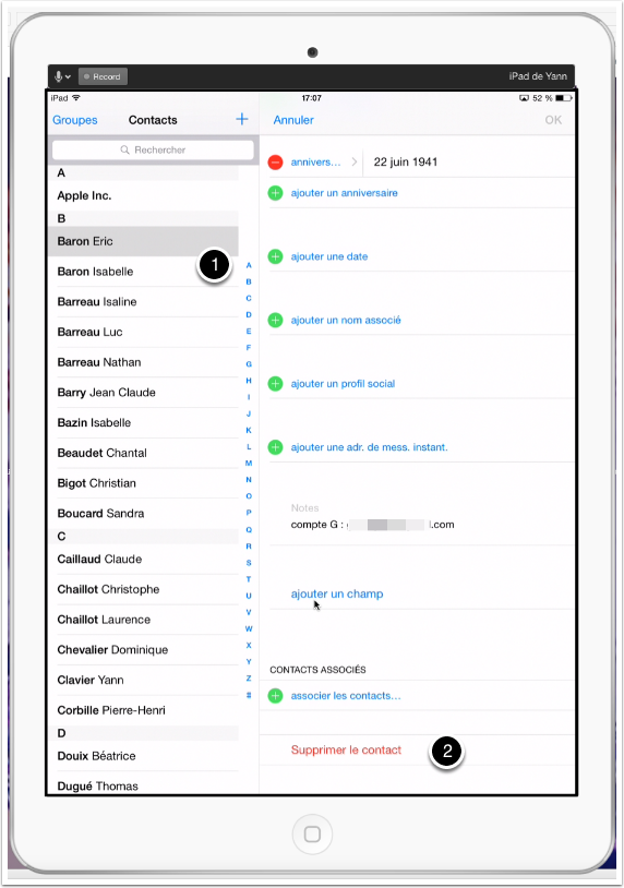 - sur la fiche choisie, un ‘tap’ sur le ’bouton’ MODIFIER‘ ensuite il faut choisir faire défiler la fiche contact vers le bas pour accéder au ’bouton’ SUPPRIMER‘