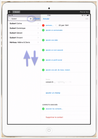 ou - faire une recherche : un tap dans la partie recherche puis saisie de ce que l’on vetu nom prénom adresse numéro de téléphone… plus on est précis, plus fin est le résultat, plus on est large, plus longeu est la liste. – Attention si on quitte on peut revenir sur ce mode. La croix a gauche de R pemet de supprimer la recherche réalisée.