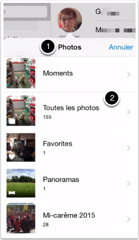 - tap pour se déplacer dans les dossiers ‘moments’, ‘toutes les photos’ ou un album en particulier et ensuite on ‘tap’ sur la photo pourqu’elle devienne celle du contact en question.