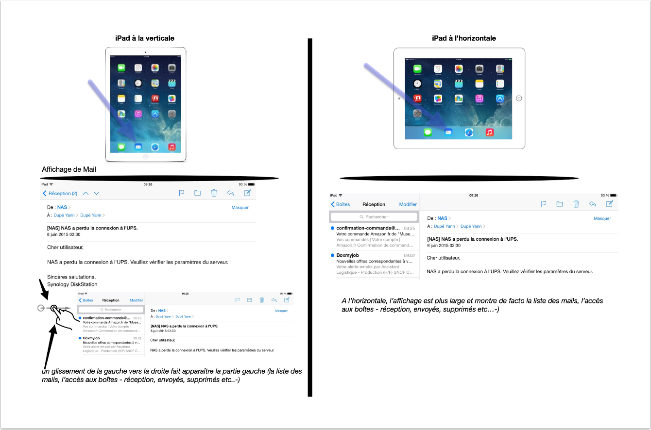 - L’application mail est (sauf personnalisation) est présente dans la barre de lancement en bas de l’écran. Par ailleurs, le partage par mail disponible dans pratiqement toutes les applications, fait appel directement à Mail.