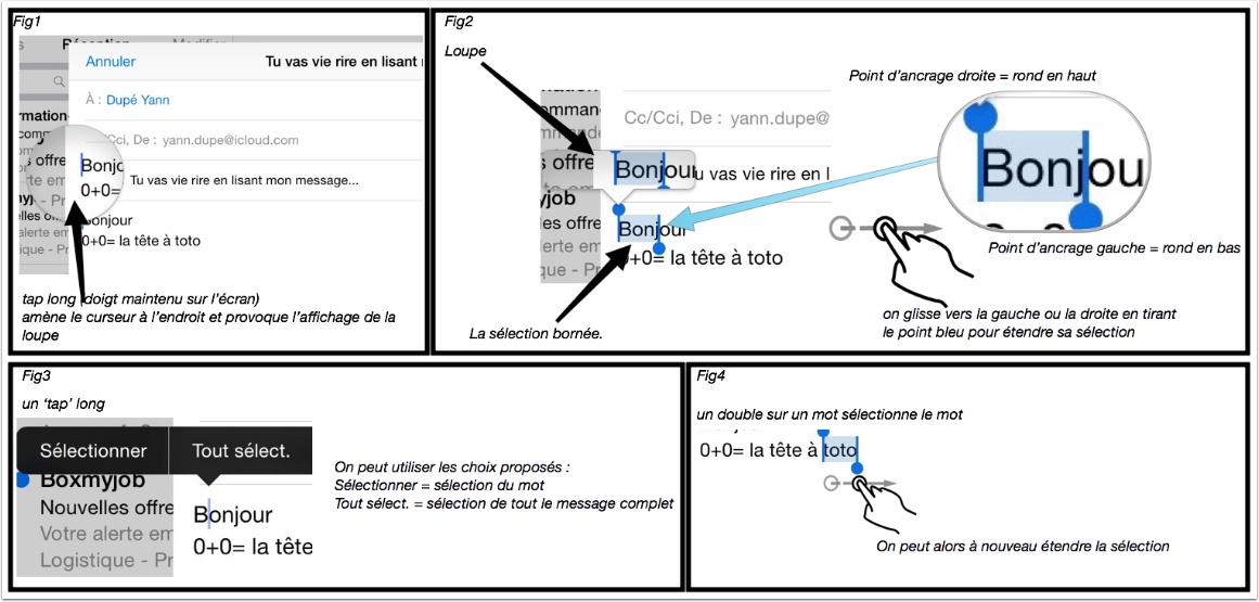 Une sélection c’est la mise en surbrillance de la partie souhaitée. On trouve alors 2 ancres (barre avec disque au desus/dessous en bleu) une au début et l’autre à la fin. Avec les doigts on décide d’augmenter par lé début ou par la fin, la zone à mettre en surbrillance, comme si on dessinait un rectangle sur l’écran. La zone de sélection se réalise en maintenant son doigt sur le point rond bleu du début ou de la fin et la loupe permet de voir ce que l’on sélectionne.
