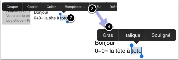 - Choisir alors Gras, Italique ou souligné. Le choix demeure pour ajouter du gras, de l’italique ou du souligné ou les 3 à chaque ‘tap’