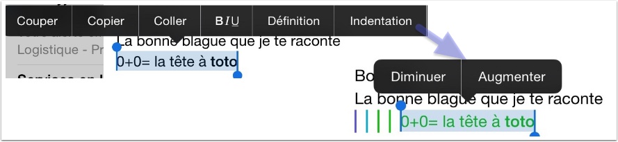 - un ‘tap’ sur la sélection provoque l’affichage du menu