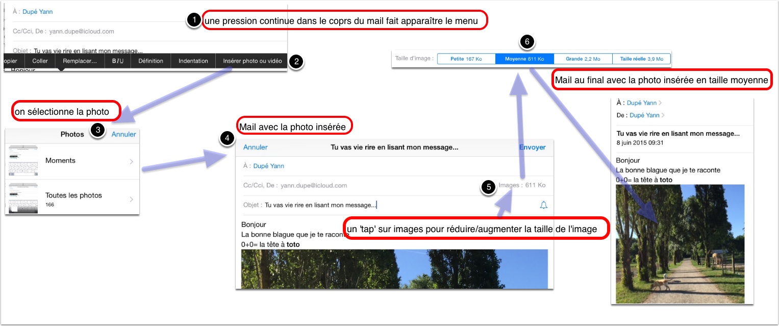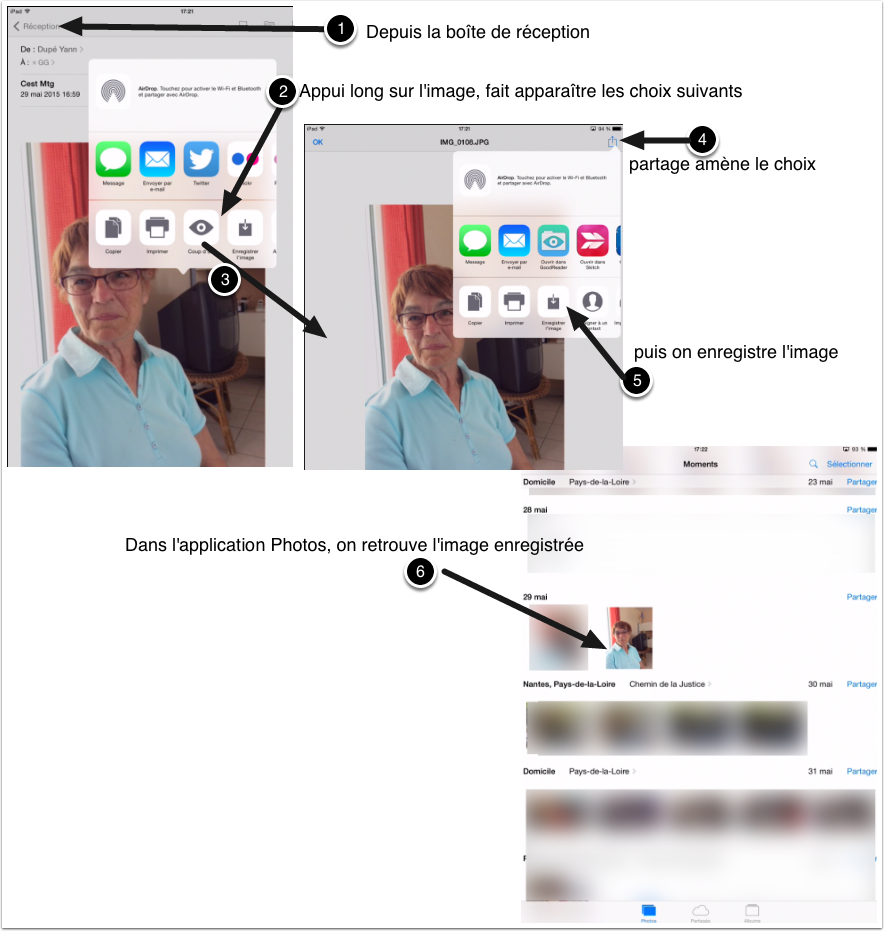 Il est plus simple de le faire à partir de l’album photo (l’application photo qui recense les photos sur ton iPad) que de le faire DEPUIS mail, mais on peut le faire aussi alors voici la marche à suivre.