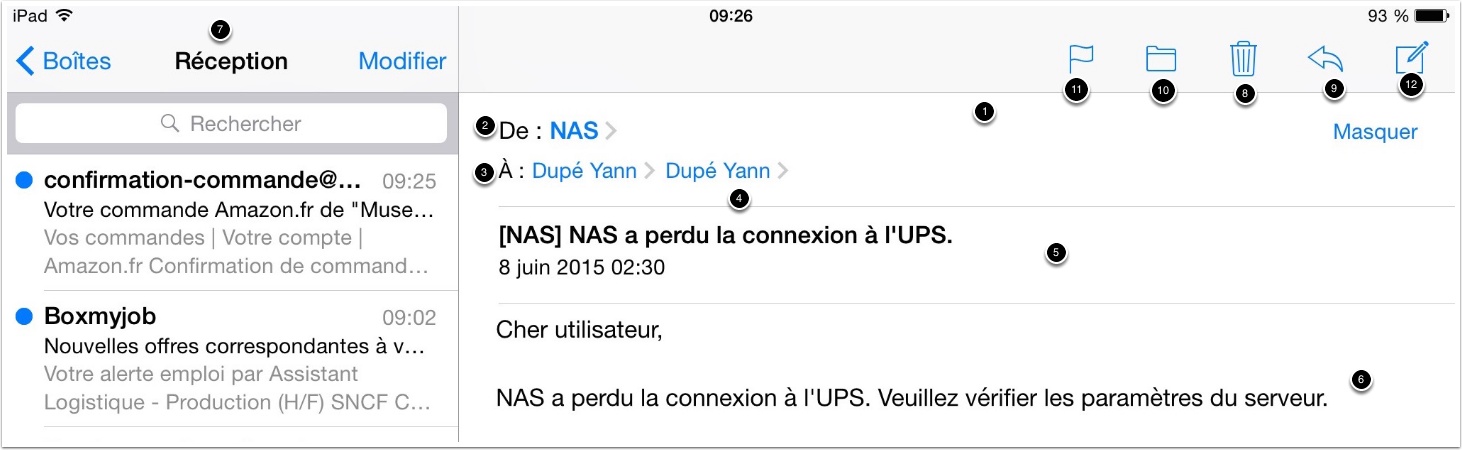- L’expéditeur : réduit au nom si connu dans mes contacts, sinon affichage d’une adresse e-mail
