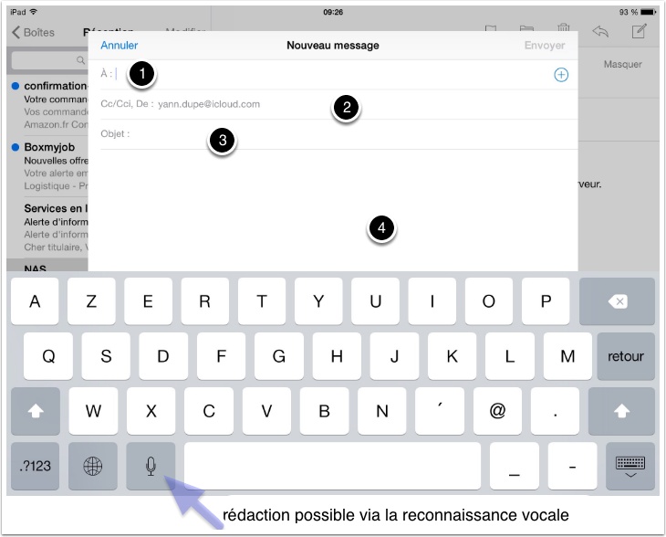 - Après avoir préciser l’objet (un ‘tap’ dans la zone ‘objet’ puis saisie des caractères ou dictée) on rédige le mail dans la partie sous l’objet. (un ‘tap’ pour s’y positionner et faire la saisie ou la dictée)