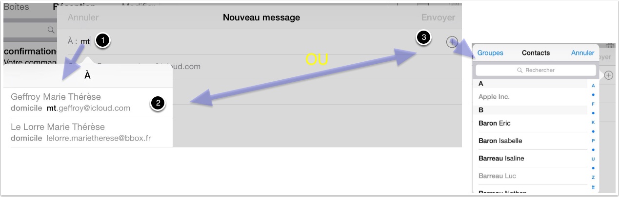- Au fur et à mesure de la saisie des caractères dans la zone A ou CC/CCI amène la recherche dans les contacts.