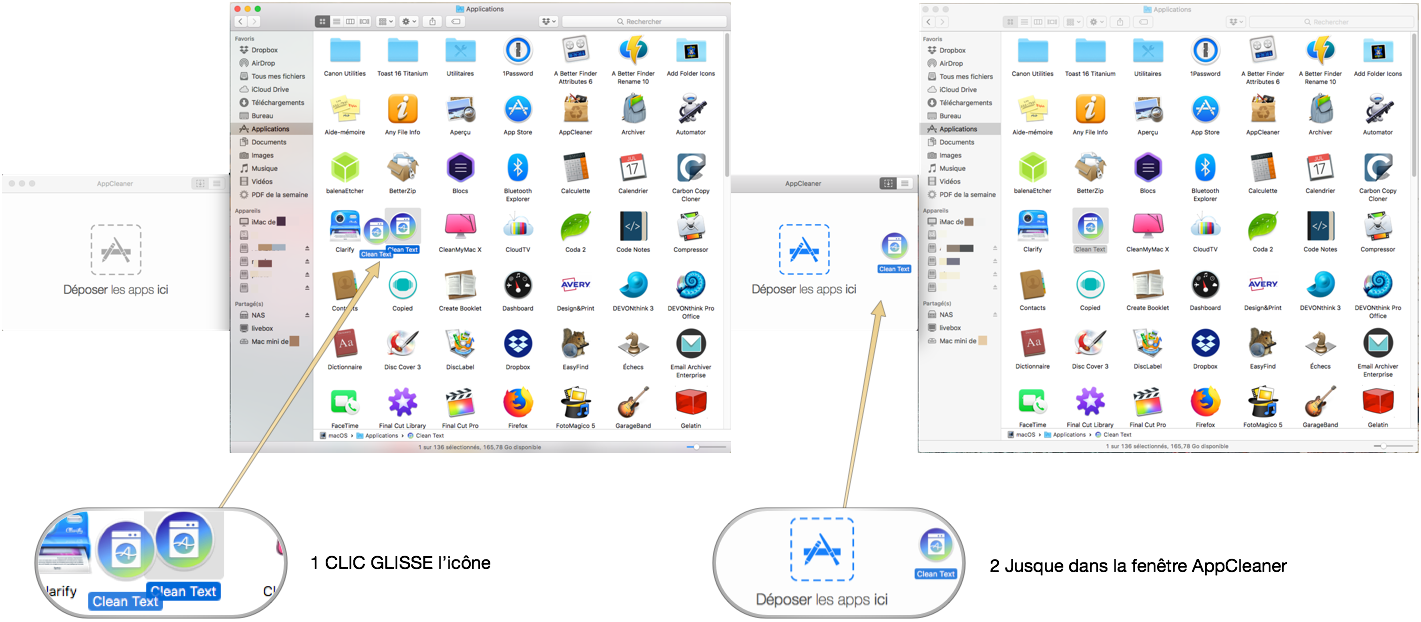 - puis glissement (clic glisser) de l’icône vers la fenêtre App Cleaner