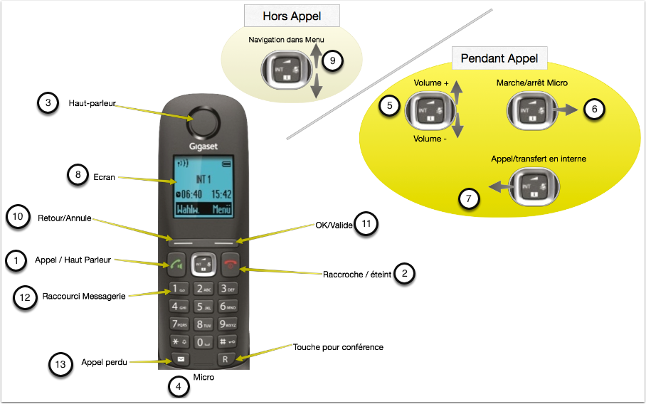 - Hors appel on navigue dans les options de l’écran vers le haut/vers le bas