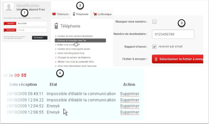 - Envoyer suppose d’avoir un document PDF XLS DOC JPG… et le numéro du fax destinataire