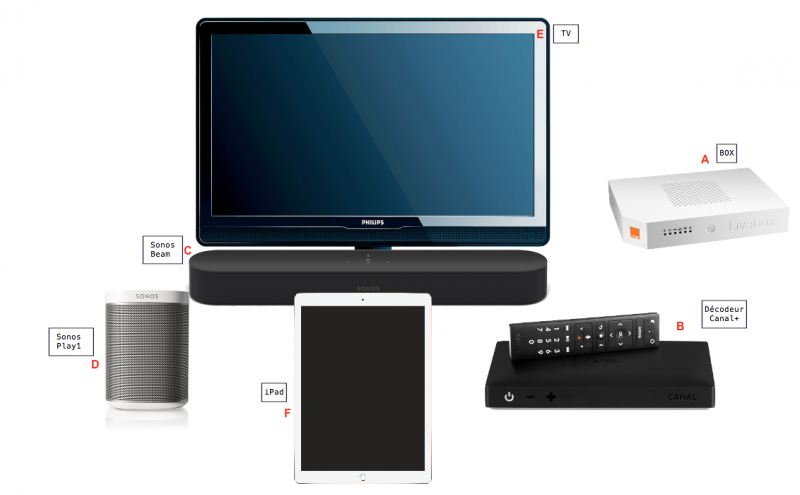 - la barre de son SONOS BEAM (identifiée Salon) est connectée à la TV. Elle diffuse automatiquement (lorsque la Tv est allumée) le son de la TV (donc du décodeur Canal+) via la connectivité filaire avec un câble HDMI (TV vers barre de son SONOS Beam).