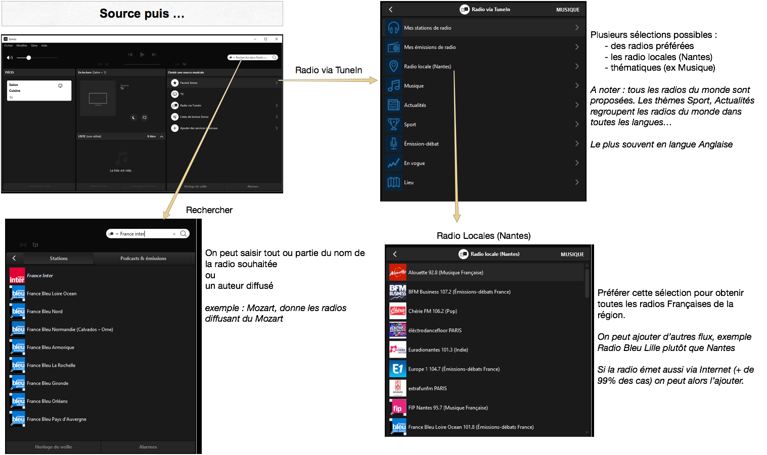 - choisir Radio via tuneIn, ou chercher dans les favoris, ou rechercher via la loupe
