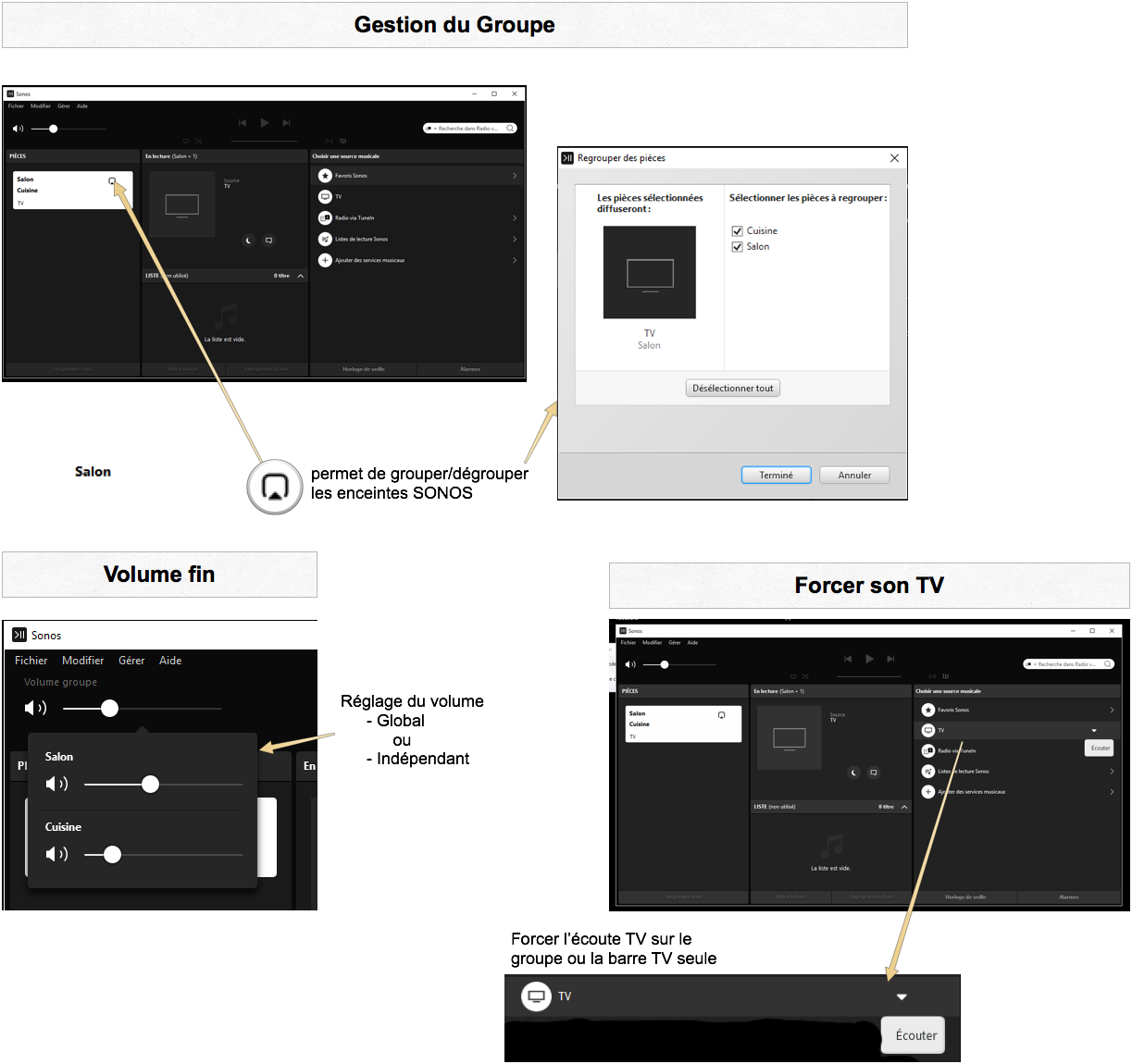 Si on créé un groupe (Salon + Cuisine) les enceintes ne font plus qu’une et le son est à la fois diffusé dans le salon et dans la cuisine.