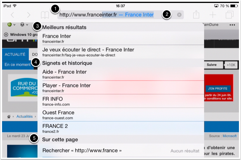 - un tap dans la barre d’adresse, pour saisir l’objet de sa recherche.