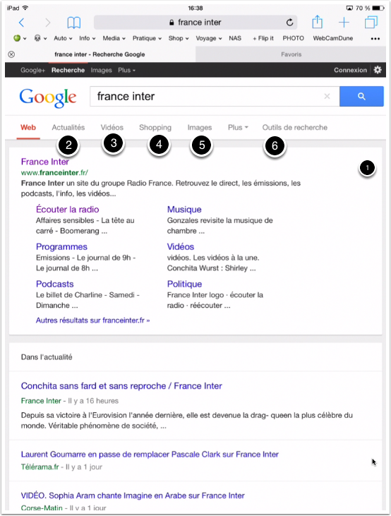Une fois la recherche réalisée sur Google, un « tap » sur le lien France inter, provoque l’affichage du site Internet Web de la radio.