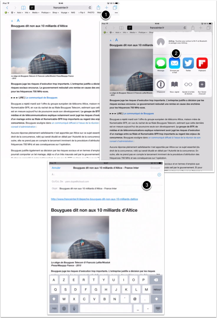 - Si le site le permet, l’affichage en mode « lecteur » permet l’envoi de la page complète dans le mail, sinon seul le lien internet de cette page est envoyée. (A activer avant de faire le « partage »)
