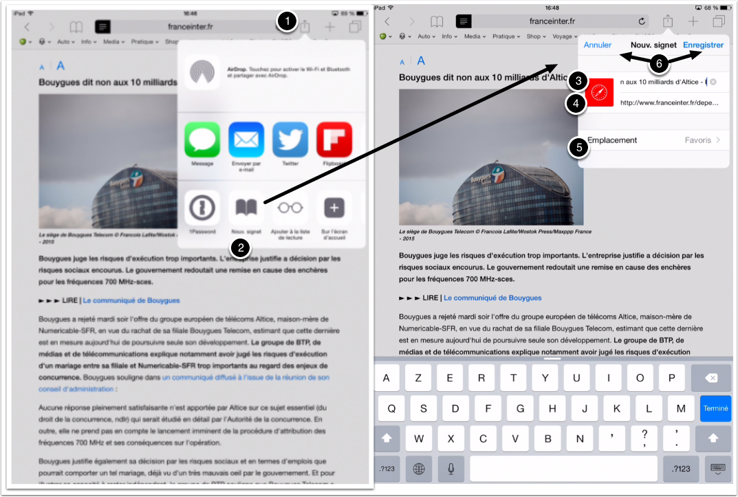 - Depuis la page web consultée, un « tap » sur l’icône partage (rectangle ouvert avec flèche vers le haut)