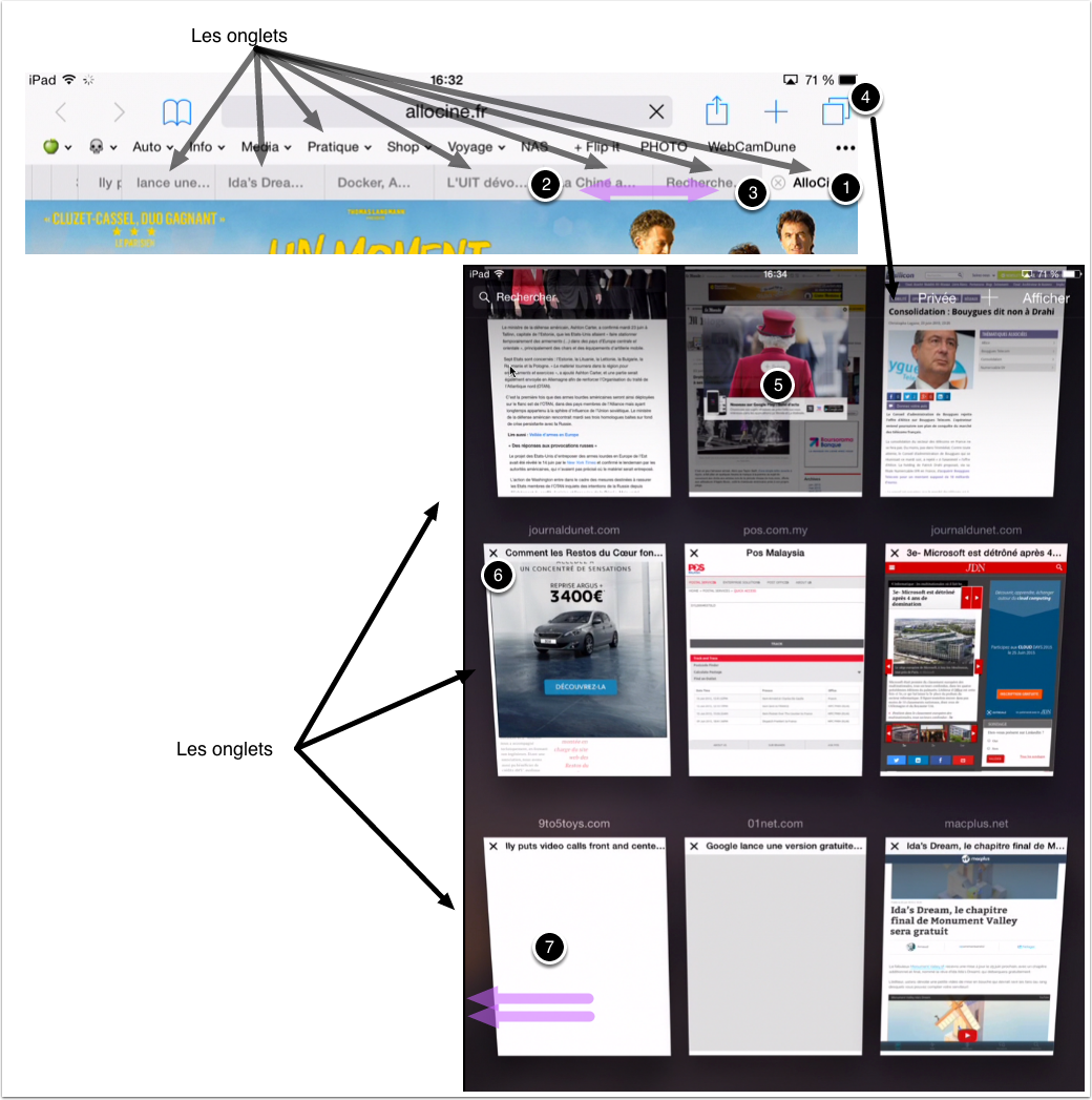 - un « tap » sur l’intercalaire, affiche l’onglet et son contenu. (on voit le contenu et l’adresse du site consulté dans la barre d’adresse et de recherche)