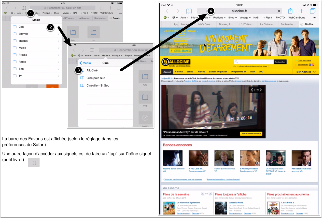 Exemple (avec un menu signet Média et son contenu Cine, images radio etc..) – Pas présent sur ton iPad à ce jour, mais demain selon tes propres ajouts.