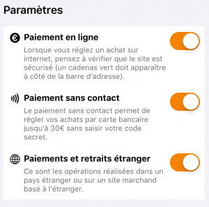 - gérer les plafonds de retrait, paiements en ligne, à l’étranger