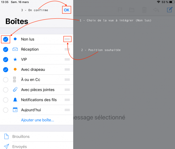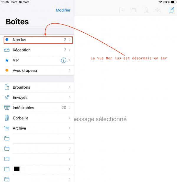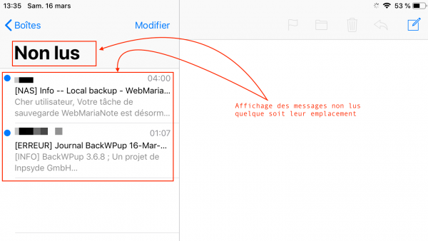 Autre solution sur iPhone et/ou iPad, utiliser un dossier spécial « Non lus » qui affiche comme son nom l’indique QUE les messages non lus quelque soit leur localisation (dossier de réception ou ailleurs)