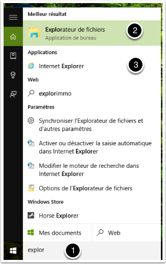 - Ici sur l’écran, on a tapé « Explor » (1) et il nous propose de lancer l’Esplorateur de Fichiers (2), Internet Explorer (3) (Il s’appel Edge désormais) etc..