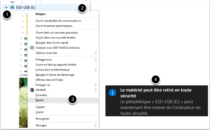 Il est conseillé d’éjecter proprement un périphérique USB. Ainsi lorsqu’une clé USB ou une carte SD est insérée dans l’ordinateur, avant de l’ôter physiquement :